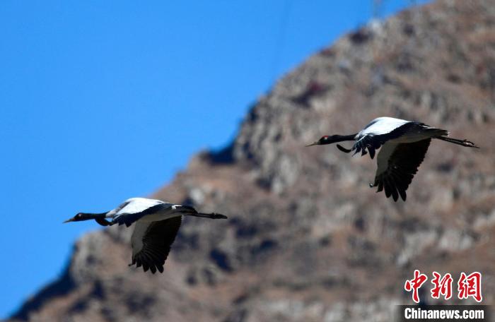 黑頸鶴是全球十五種鶴類中唯一在高原地區(qū)繁殖和越冬的鶴類,被譽(yù)為“高原神鳥”,屬中國國家一級(jí)保護(hù)動(dòng)物。每年10月中下旬左右,黑頸鶴陸續(xù)飛抵雅魯藏布江中游河谷等地越冬。圖為11月3日,黑頸鶴在西藏拉薩達(dá)孜區(qū)上空飛翔。中新社記者 李林 攝