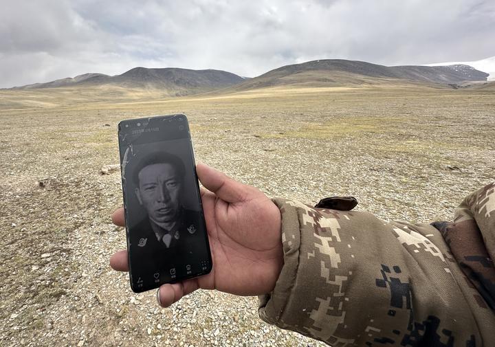 2024年6月15日,在西藏那曲市尼瑪縣境內(nèi)的羌塘國家級自然保護(hù)區(qū)“無人區(qū)”深處,格桑倫珠向記者展示他手機(jī)中珍藏的羅布玉杰的照片。新華社記者費(fèi)茂華攝