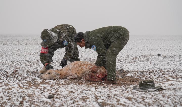 受傷的母羊在漫天風(fēng)雪中蹣跚了200多米后,倒下了。一直在觀望的索朗和羅布來到它身邊,輕輕地?fù)崦纳眢w,口中念念有詞,然后用塑料布在母羊的腦袋旁邊“搭建”了一個小帳篷,為它擋風(fēng)遮雪,幫它度過最后的時光。
