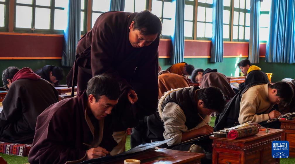 11月22日,昌都市丁青縣擁忠文化藝術(shù)中心非遺扶貧就業(yè)工坊老師在指導(dǎo)學(xué)員寫藏文書法。新華社記者 格桑朗杰 攝
