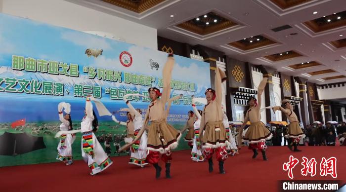 圖為班戈縣“鄉(xiāng)村振興 那曲奮進(jìn)”活動(dòng)成果轉(zhuǎn)化暨文藝文化展演、第三屆畜產(chǎn)品展銷會(huì)開(kāi)幕式歌舞演出。洛桑斯卓 攝