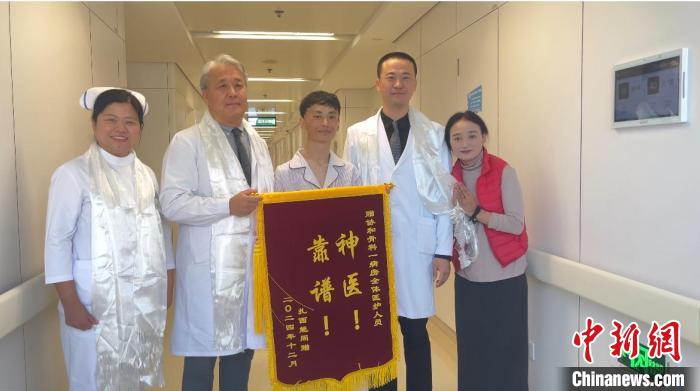 12月3日,在北京協(xié)和醫(yī)院接受脊柱側(cè)彎矯形手術(shù)的藏族青年扎西能周(右三)和母親(右一)向醫(yī)院骨科一病房的醫(yī)護(hù)人員獻(xiàn)哈達(dá)并送上錦旗。黃欣欣 攝