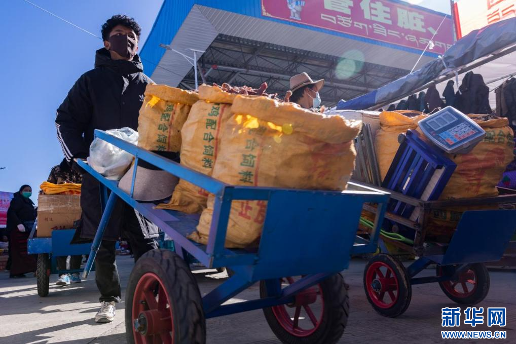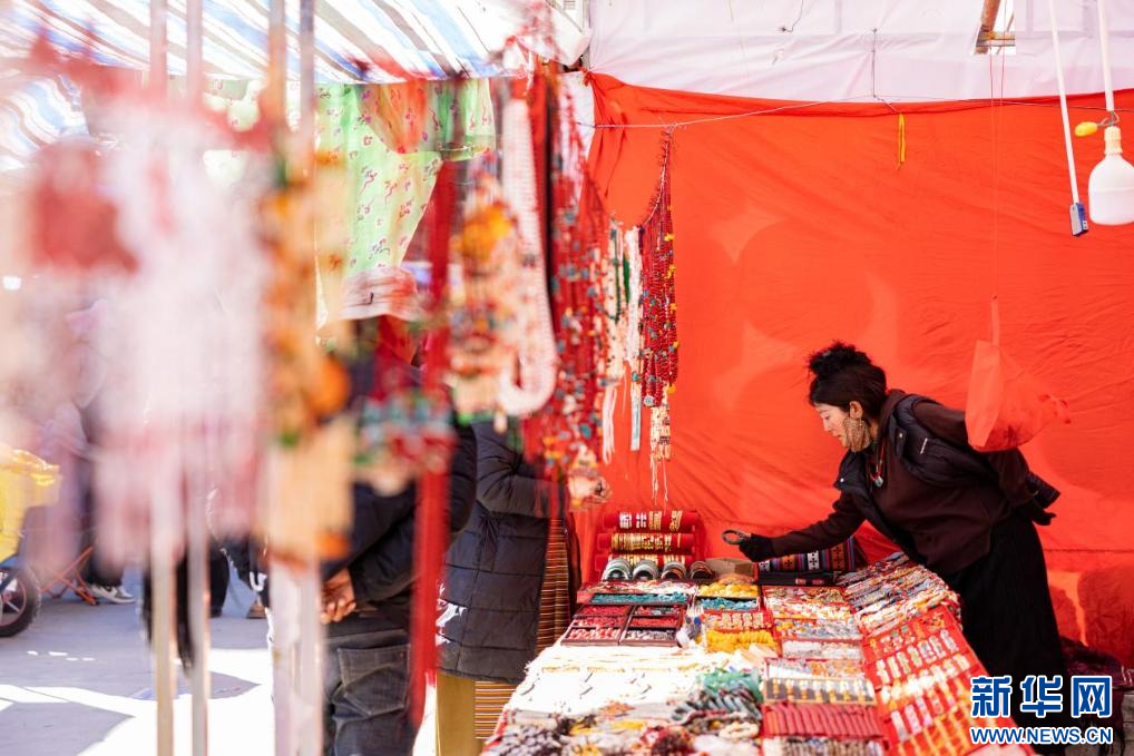 在現(xiàn)場(chǎng),人來人往,商品琳瑯滿目。扎念琴聲、推車聲、嬉笑聲此起彼伏,一派熱鬧繁忙的景象。