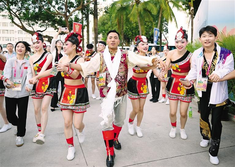 11月26日,運動會特別安排了“民族大聯(lián)歡”活動。獨具海南特色的牛角號與蛙鑼齊齊奏響,喜迎八方賓客,表演者、運動員、教練員一起手拉手載歌載舞。西藏運動員身著盛裝,和來自北京西藏中學(xué)的運動員一起唱藏歌、跳鍋莊、送禮物,和香港特別行政區(qū)運動員互送吉祥物、紀(jì)念品,相互交流、拍照留念。