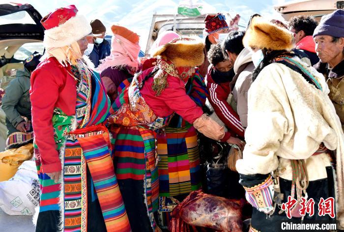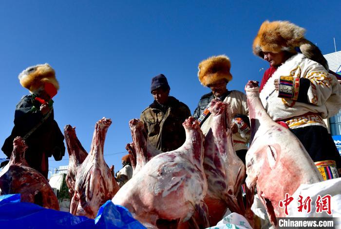 12月6日,西藏那曲市申扎縣第十八屆畜產(chǎn)品展銷會正式開幕,40余家優(yōu)質(zhì)牧民合作社和企業(yè)帶著畜產(chǎn)品、手工藝品等當?shù)靥厣a(chǎn)品參展,現(xiàn)場人頭攢動、購銷兩旺。圖為展銷會現(xiàn)場,買賣雙方商談羊肉價格。中新社記者 李林 攝