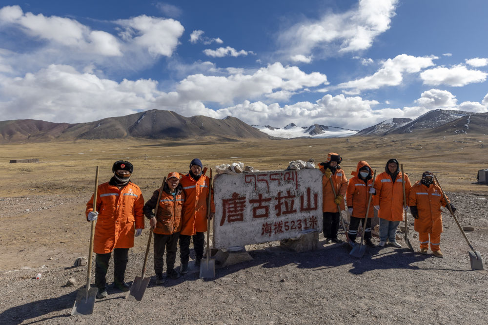 記者一行到達(dá)唐古拉山口時(shí),7名身穿橙色制服的養(yǎng)路工人,正在用鐵鍬修補(bǔ)路肩。盡管太陽(yáng)高懸,風(fēng)速卻不小,用來警示隔離的錐形交通路標(biāo)不斷被大風(fēng)吹倒,工人們不時(shí)要把它們扶正。