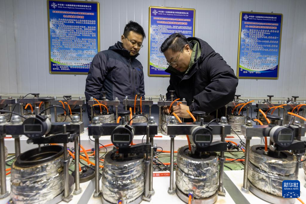中交第一公路勘察設計研究院有限公司格爾木觀測研究基地主任陳冬根(左)與同事在實驗室里檢查凍土樣品(12月3日攝)。新華社記者 姜帆 攝