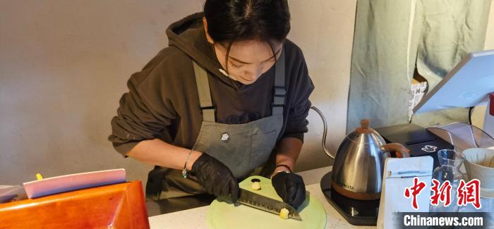 12月14日,檸渡咖啡館的店員在切酥油,準(zhǔn)備做“拉薩拿鐵”咖啡。中新社記者 趙凜松 攝