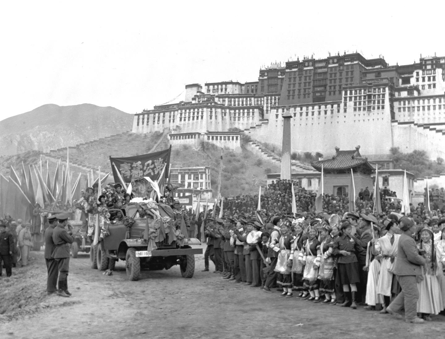 1954年12月25日,在西藏拉薩布達拉宮前舉行的通車典禮上,拉薩市群眾歡迎從青藏公路開到拉薩的汽車隊。