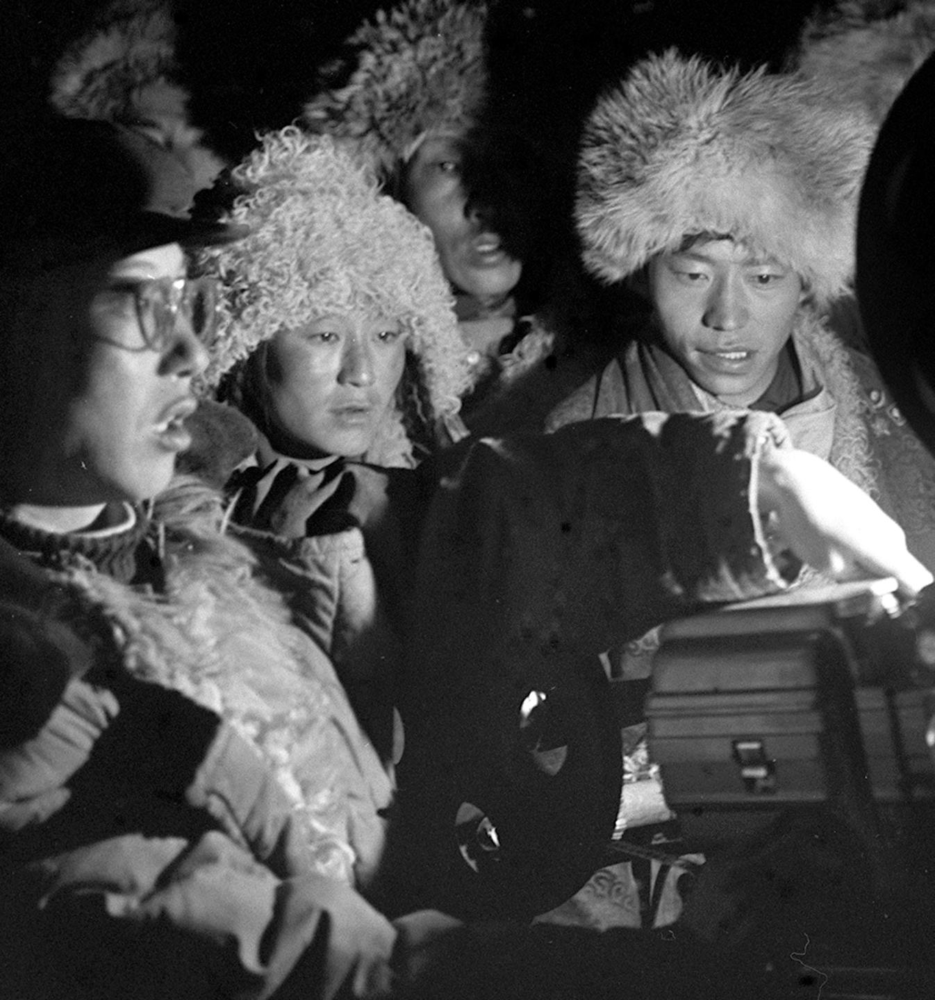 1964年,西藏安多縣的牧民們圍著電影放映機,等待電影開演。川藏、青藏公路通車后,沿路地區(qū)面貌一新,曾經(jīng)荒僻的地方,居民們也能看到電影了。