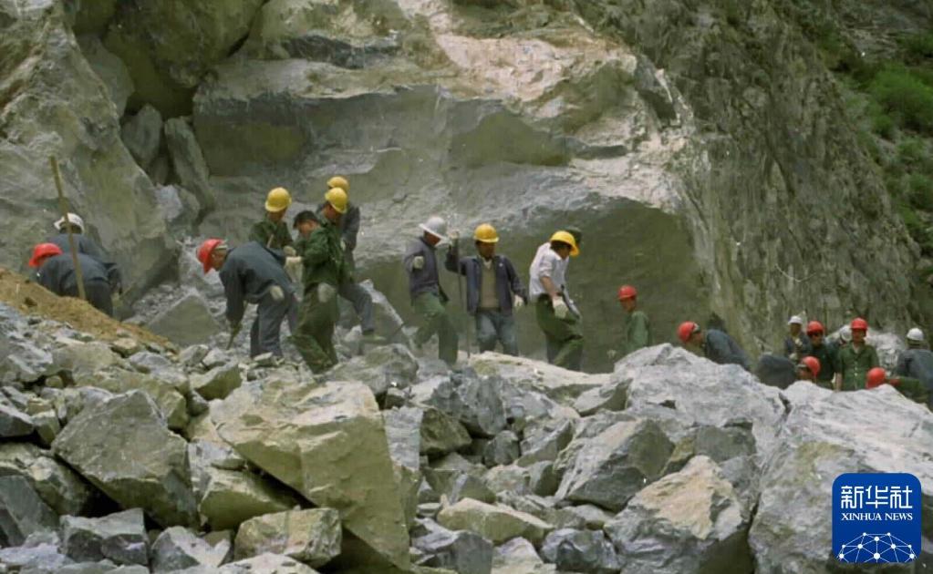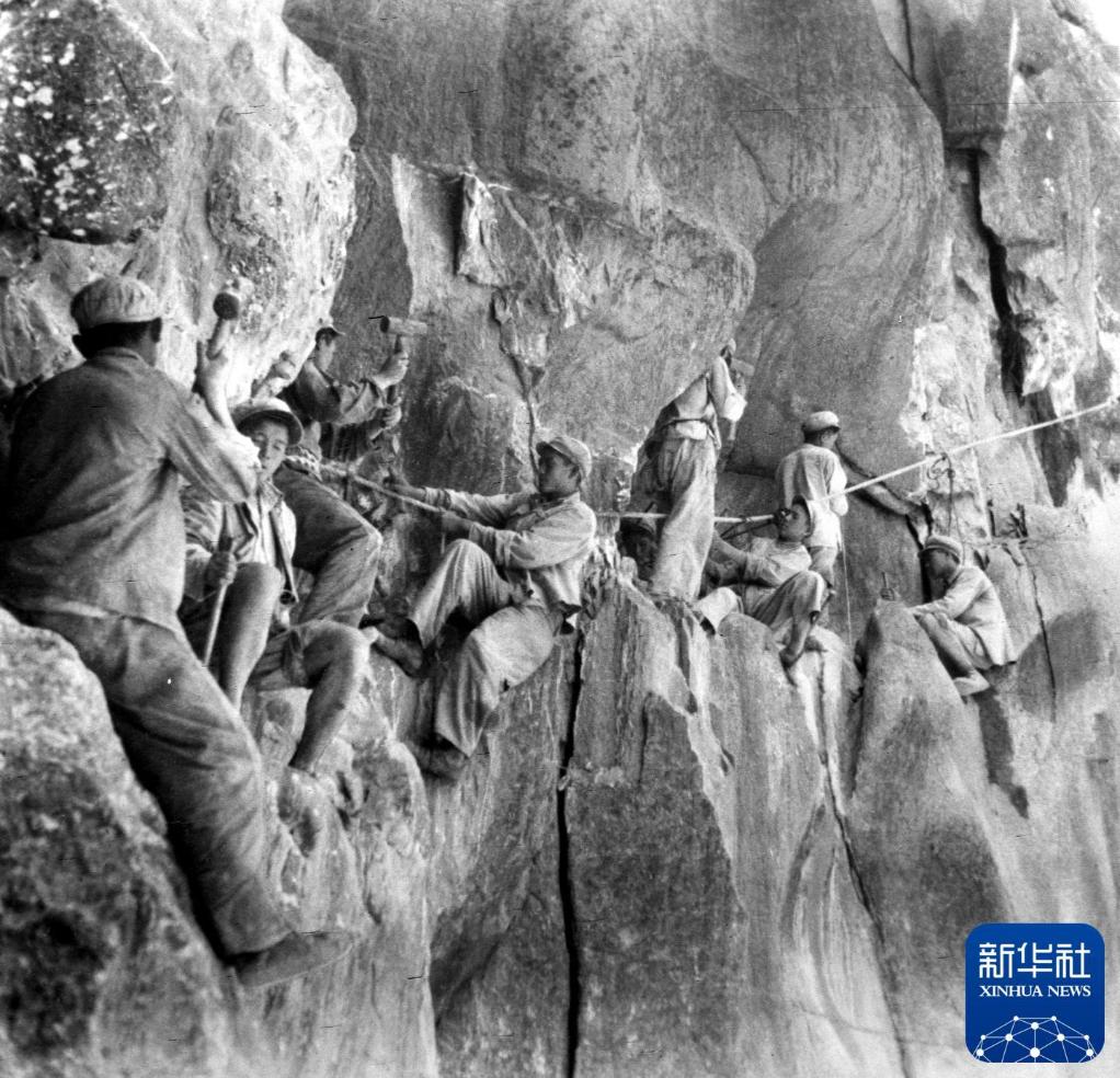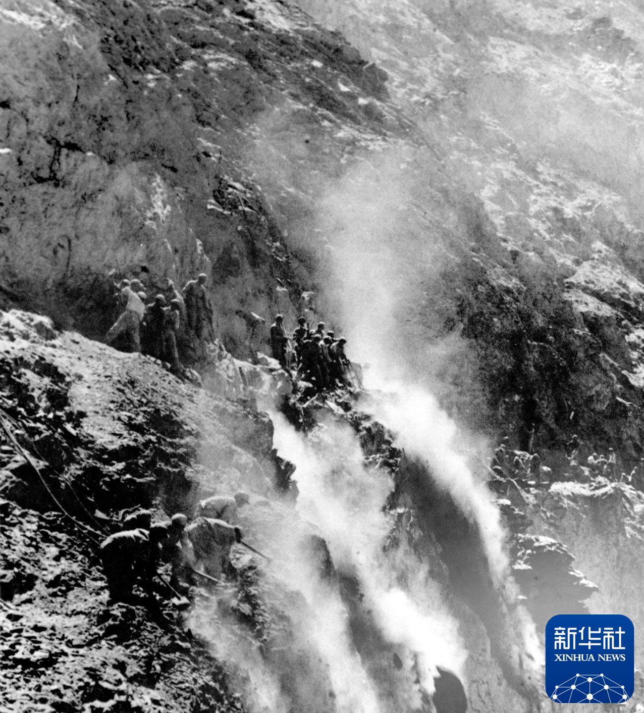 這是筑路戰(zhàn)士在懸崖絕壁上修建川藏公路。新華社發(fā)