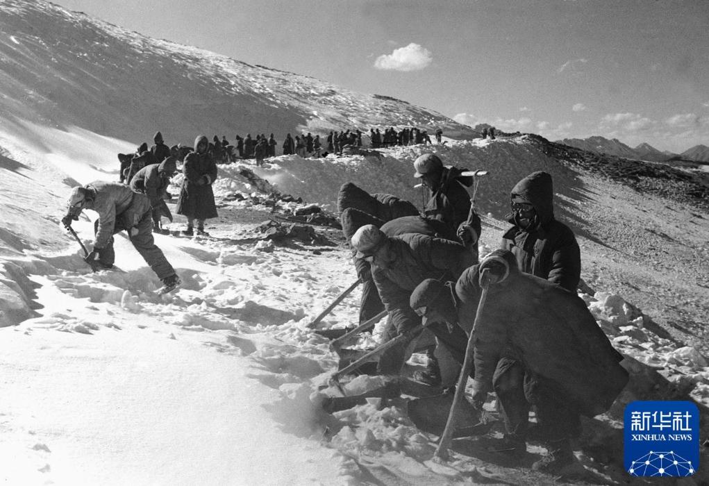 1952年,筑路民工在甲皮拉山頂鏟除冰雪,讓汽車通過。新華社記者 趙慎應(yīng) 攝