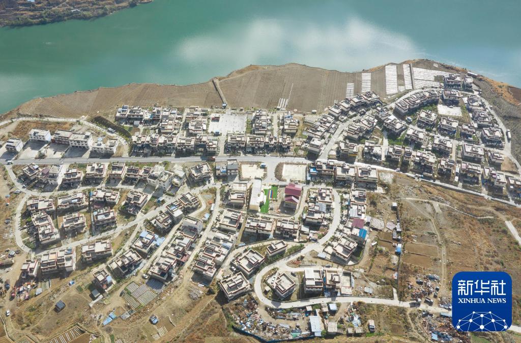 2019年4月16日,在川藏公路沿線的四川瀘定縣瀘橋鎮(zhèn)咱里村,移民新村面貌一新(無人機(jī)照片)。新華社記者 江宏景 攝