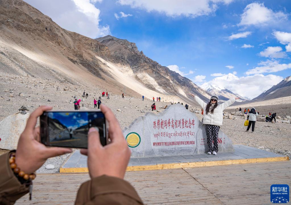 2024年5月24日,游客在珠穆朗瑪峰高程測(cè)量紀(jì)念碑前拍照留念。新華社記者 孫非 攝