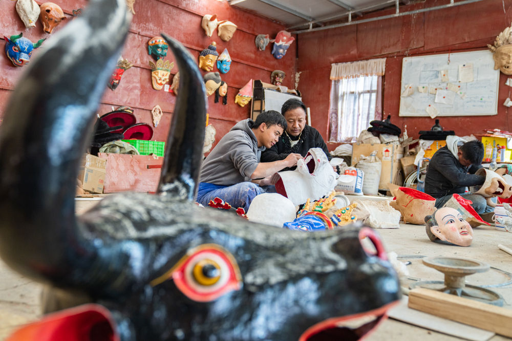 拉薩布制面具制作技藝西藏自治區(qū)級非遺傳承人西洛(左)和同事交流西藏傳統(tǒng)面具制作心得。