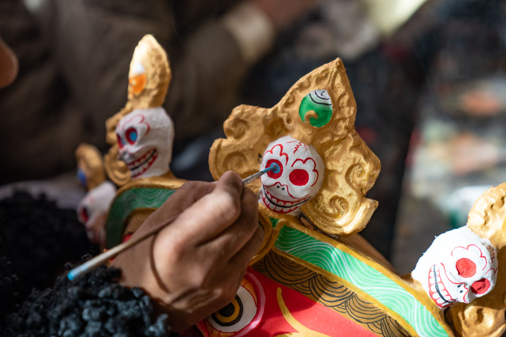 20世紀(jì)90年代,西洛就跟隨師父在西藏各地制作藏戲面具。一開始,他認(rèn)為面具制作只是一門糊口的手藝。但其實(shí)面具在藏戲表演中十分重要,演員表演藏戲時(shí)無需化妝,主要是戴面具表演。整體上看,藏戲分為白面具戲和藍(lán)面具戲。在同一臺藏戲中,又會出現(xiàn)紅、白、藍(lán)、黑、黃等不同顏色的面具,代表不同身份。