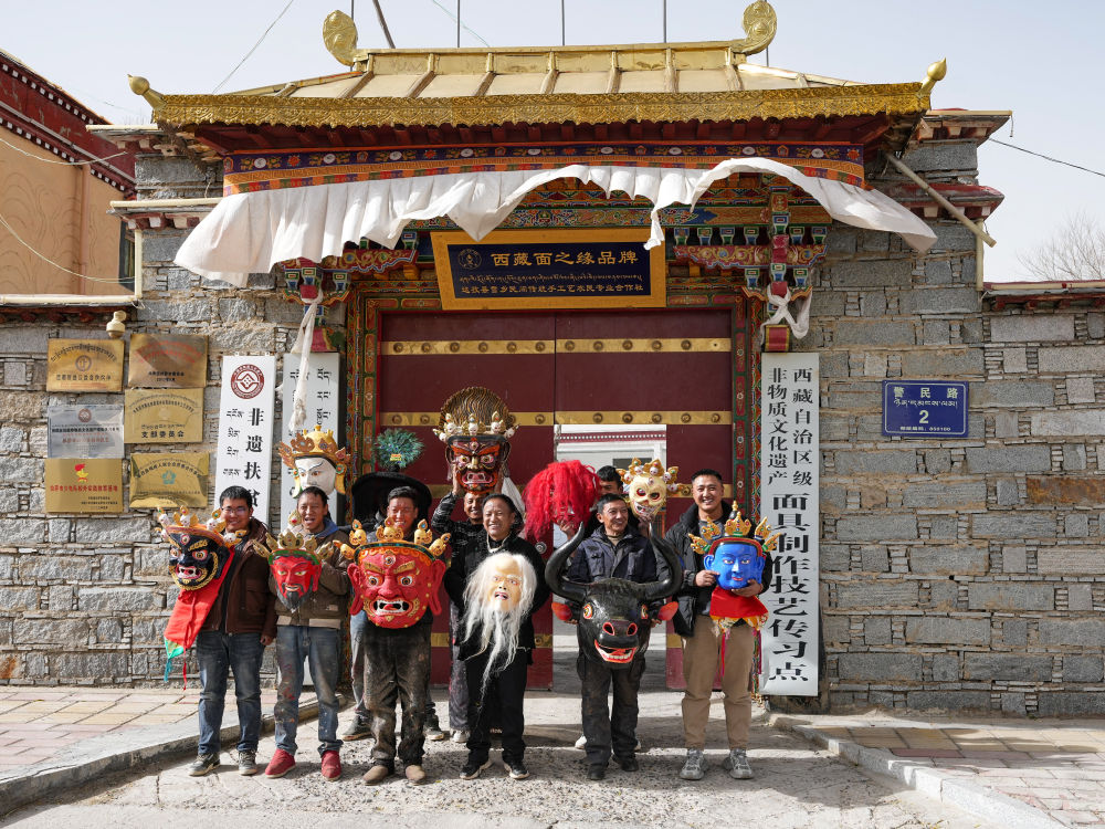 拉薩達(dá)孜區(qū)雪鄉(xiāng)民間傳統(tǒng)手工藝農(nóng)民專業(yè)合作社的面具制作工匠們在合作社門口合影。