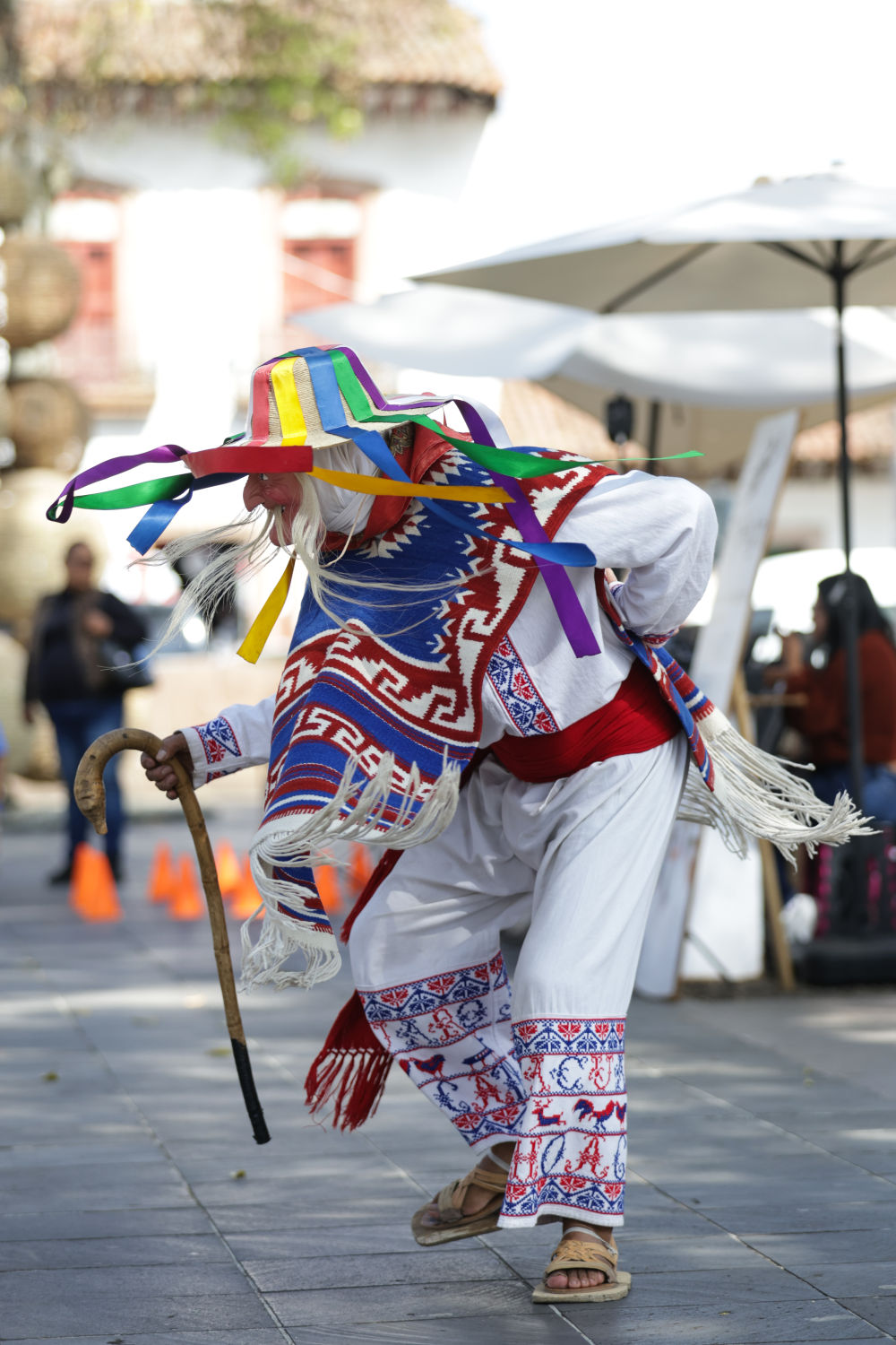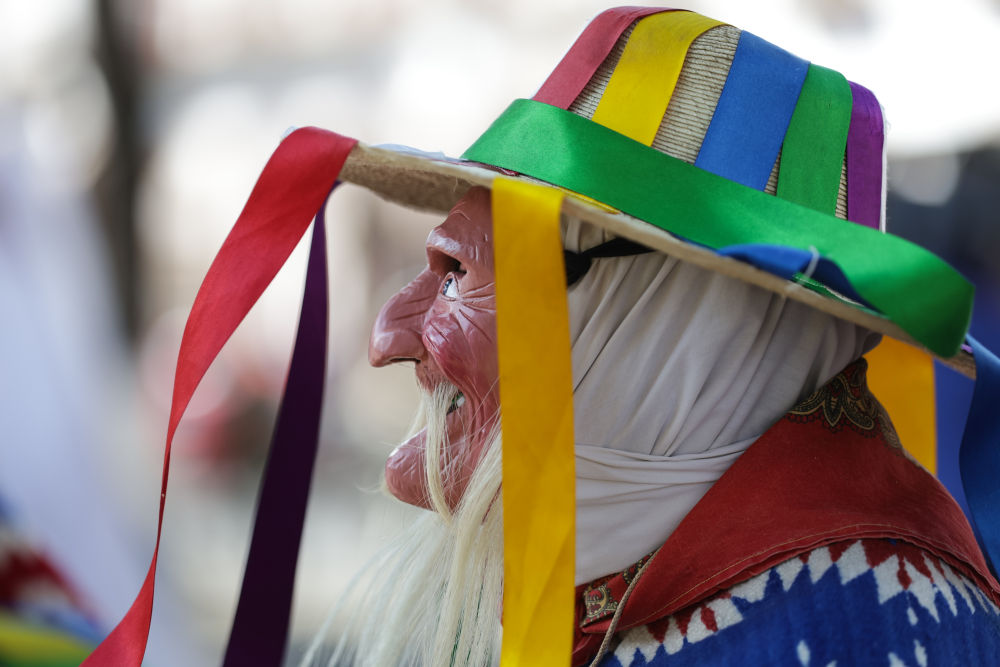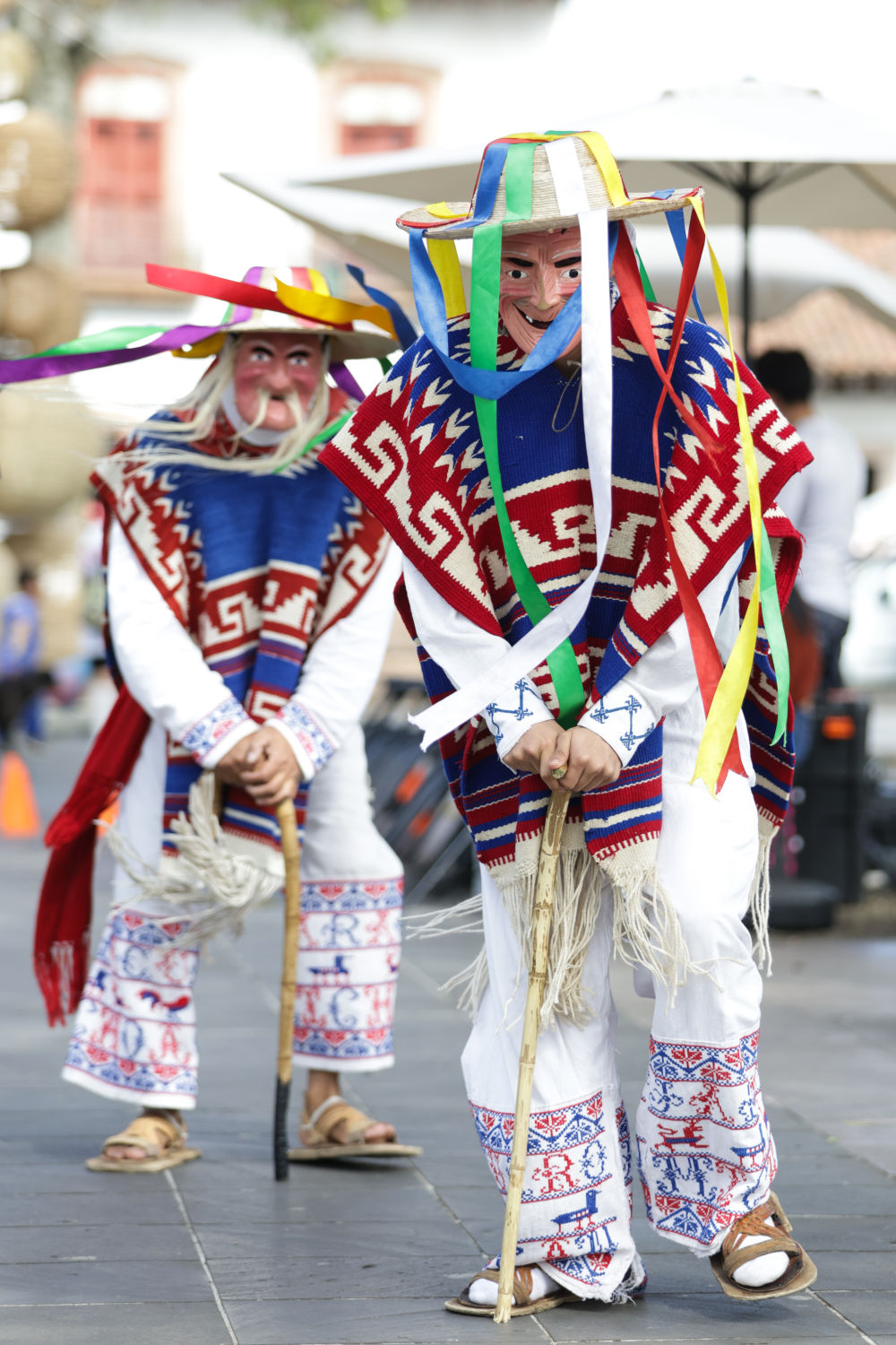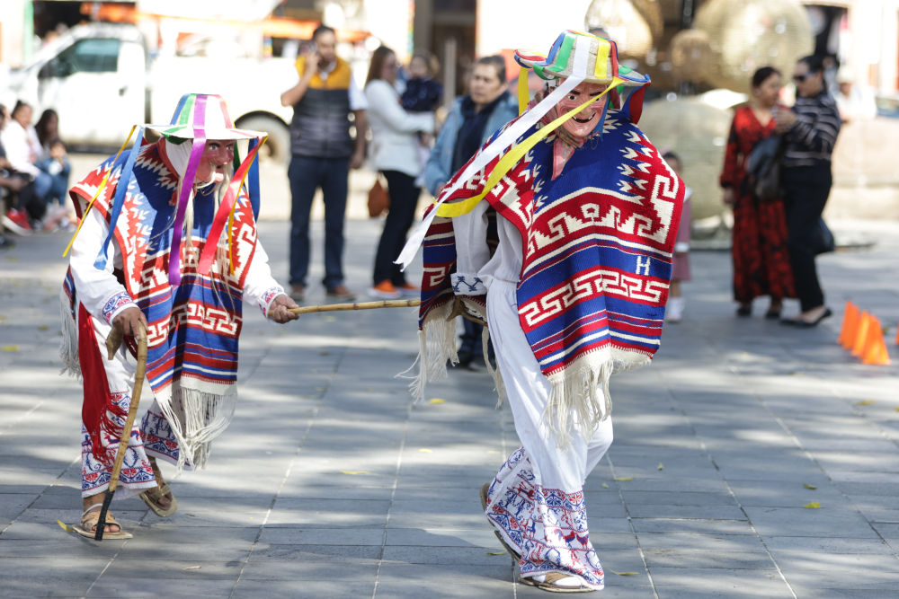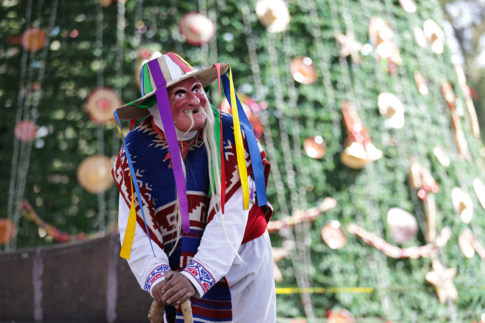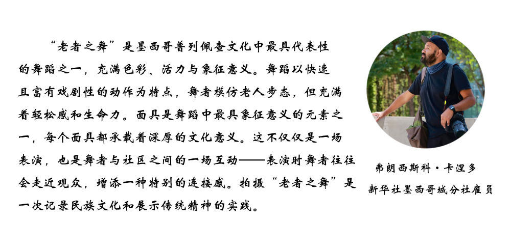 面具制作在墨西哥也有著悠久的歷史,有各式各樣的面具用于各種舞蹈和慶典。舞者表演“老者之舞”時(shí)往往配戴著略顯夸張的面具,面具通常帶有皺紋、胡須和微笑的表情,借以塑造一種看似滑稽、幽默卻充滿智慧的形象。除了老人面具,舞者表演時(shí)還會穿著傳統(tǒng)的普列佩查民族服飾,包括刺繡彩色披肩、白色農(nóng)民風(fēng)格的長衫和編織草帽,整體造型鮮艷、喜慶。舞蹈表演時(shí)舞者會模仿老人的步態(tài),以滑稽的方式彎腰駝背,手持拐杖或木棍,搖搖晃晃地邁步,同時(shí)做出靈活的跳躍和旋轉(zhuǎn)動作,展現(xiàn)一種出人意料的活力與生命力。