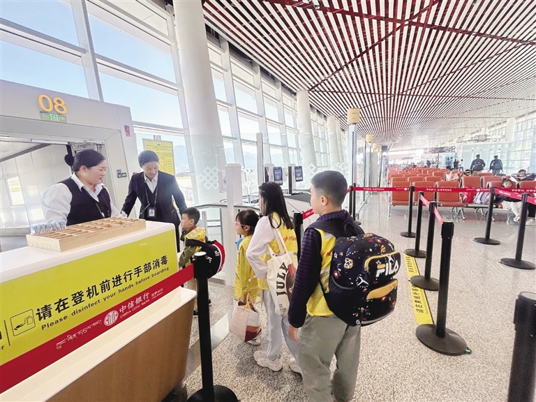 張女士表示,辦理完申請手續(xù)后,她在航班起飛前2—3小時左右到達拉薩貢嘎國際機場,在B01特殊服務柜臺(除西藏航空外)辦理了乘機手續(xù),工作人員仔細核對了小朋友的有效身份證件信息、申請書、接送機人的姓名、聯(lián)系方式、住址、行李等情況,并為無陪兒童佩戴了無陪標識掛帶和黃色馬甲。登機前,會有專人全程陪伴無陪兒童通過安全檢查、登機,最后交接給機組,由機組幫小朋友找到座位、擺放行李,完成登機流程。