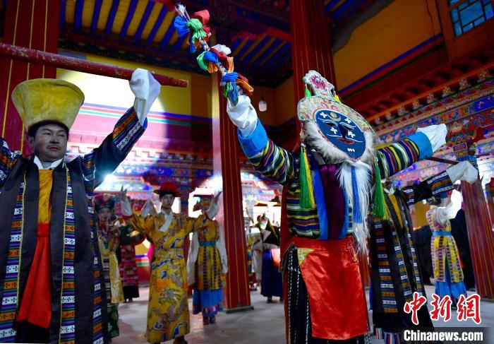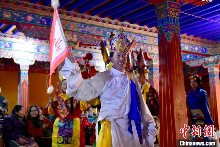 1月2日晚,一場視聽結(jié)合、感官沉浸的拉薩傳統(tǒng)演藝服飾秀在西藏自治區(qū)拉薩市喜德林古建大院上演。囊瑪堆諧、覺木隆藏戲等非遺的演繹,讓觀眾領(lǐng)略到拉薩深厚的文化底蘊。圖為拉薩傳統(tǒng)演藝服飾秀演出現(xiàn)場。中新社記者 李林 攝
