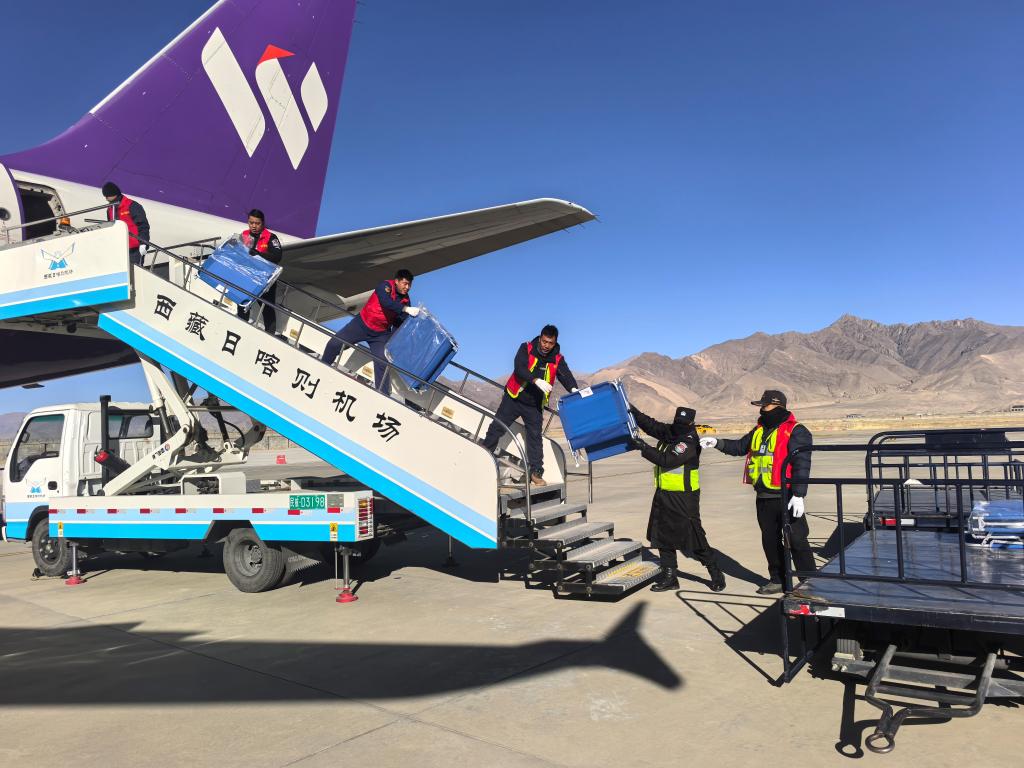 1月9日上午,救援物資抵達(dá)西藏日喀則機(jī)場。新華社發(fā)