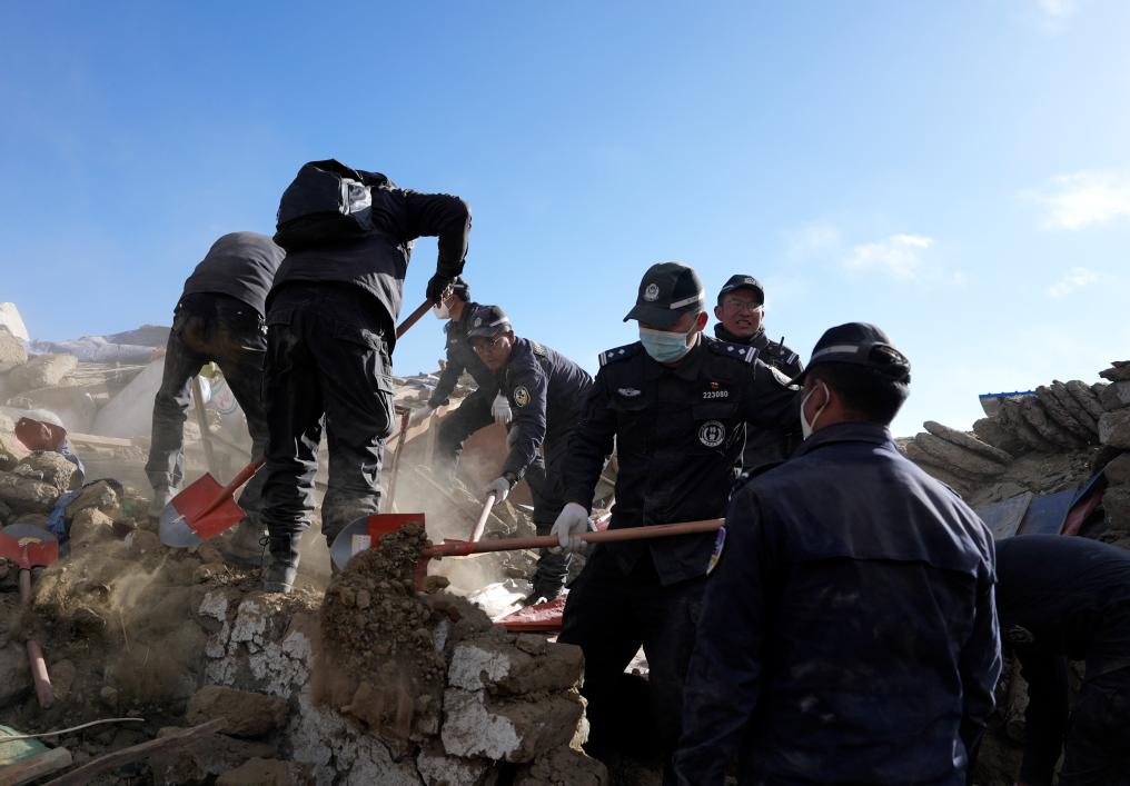 1月7日,救援人員在定日縣長所鄉(xiāng)古榮村進(jìn)行搜救。