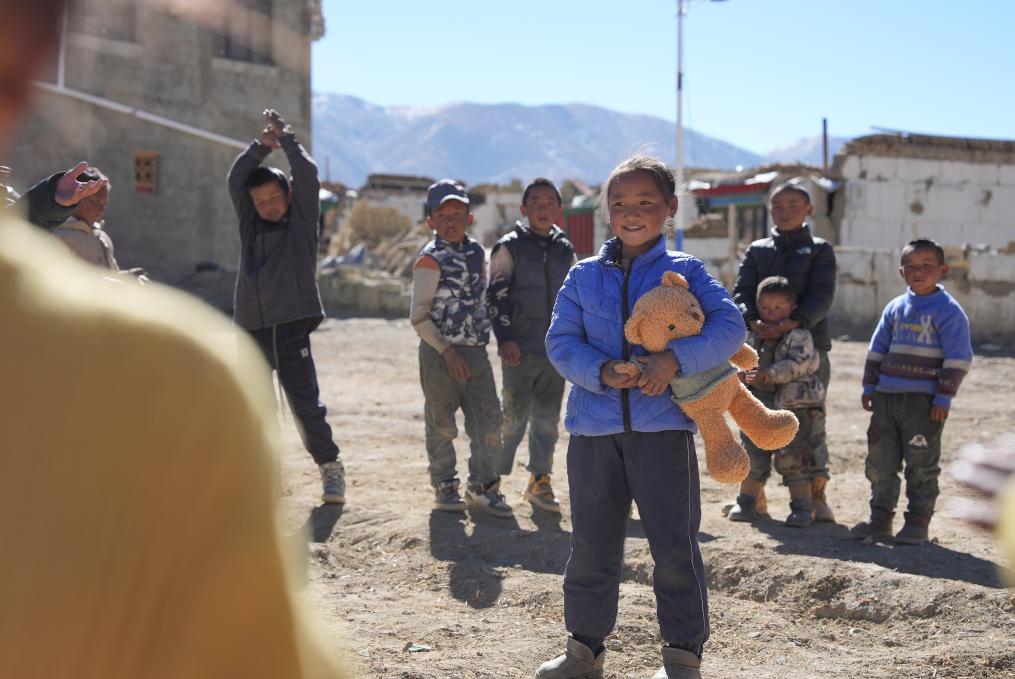 1月8日,在日喀則市定日縣措果鄉(xiāng)塘仁村地震災(zāi)后安置點(diǎn),西藏星光社會(huì)工作服務(wù)中心社工向孩子們贈(zèng)送玩偶熊,并給他們表演節(jié)目。