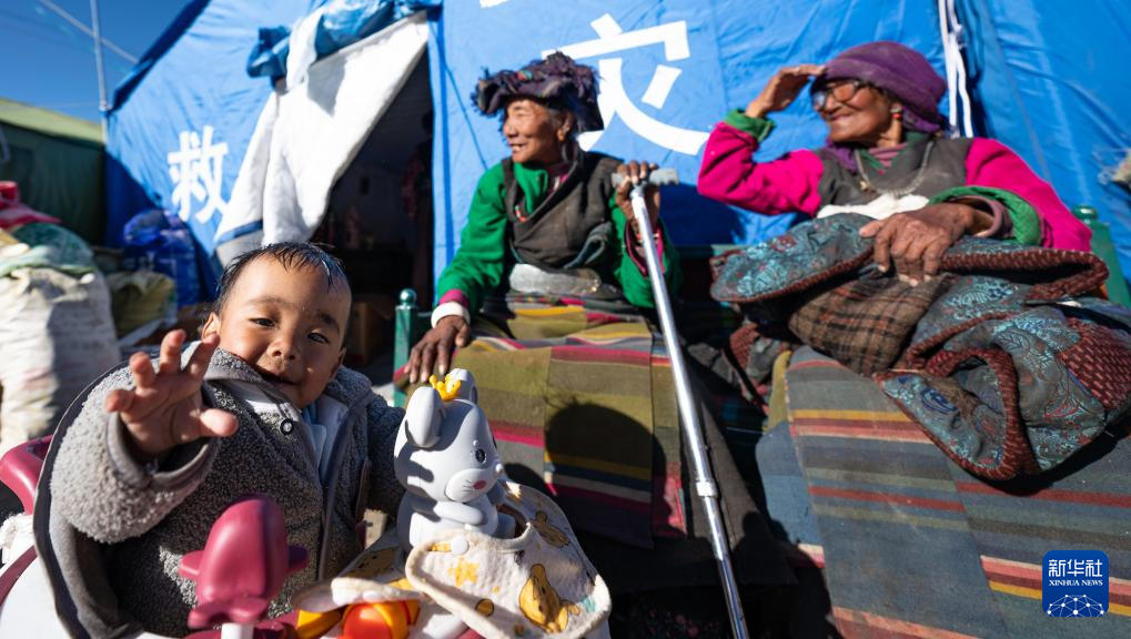 1月10日,在定結(jié)縣郭加鄉(xiāng)切村安置點(diǎn),老人和孩子在救災(zāi)帳篷前休息、曬太陽(yáng)。新華社記者 丁增尼達(dá) 攝