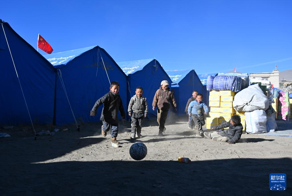 1月11日,小朋友在普村安置點(diǎn)踢球。新華社記者 姜帆 攝