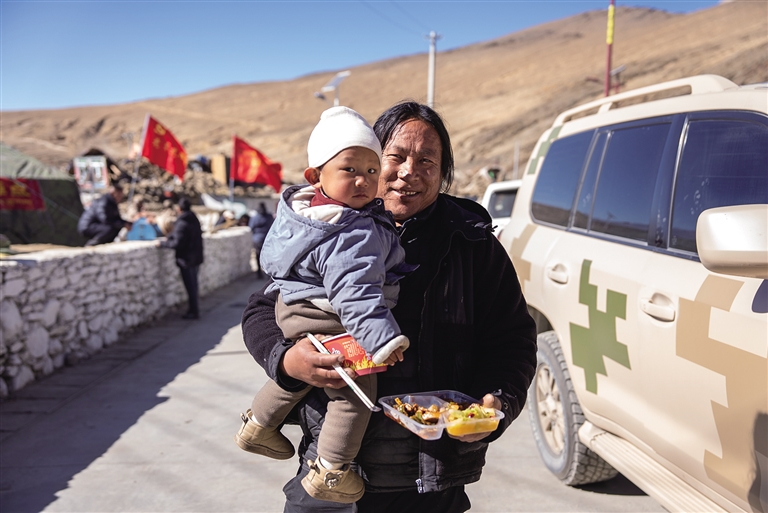 在定日縣措果鄉(xiāng)的愛心人士為當(dāng)?shù)厥転?zāi)群眾提供免費熱食。