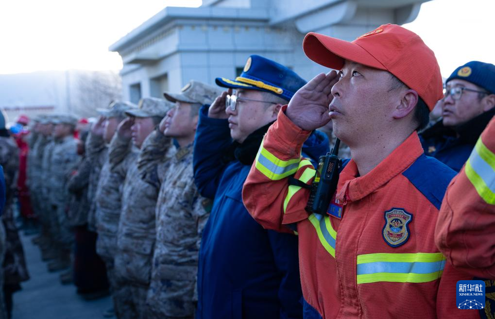 1月13日上午9時(shí)30分,西藏定日6.8級(jí)地震遇難同胞悼念儀式在受災(zāi)最嚴(yán)重的長(zhǎng)所鄉(xiāng)舉行。參與救援的解放軍和武警官兵、消防救援人員、公安民警、醫(yī)護(hù)人員、青年志愿者及有關(guān)企業(yè)員工、干部職工、震區(qū)群眾代表數(shù)百人,脫帽肅立,向遇難同胞默哀3分鐘。新華社記者 丁增尼達(dá) 攝
