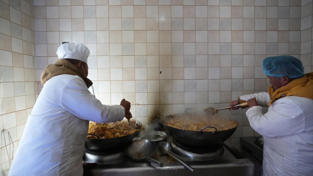 1月14日,服務(wù)隊(duì)的兩名廚師正在為村民們做午飯。新華社記者 邱星翔 攝