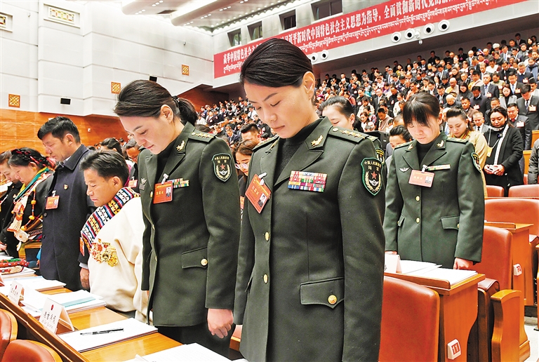 大會開幕前,全體人員起立,向地震中不幸遇難的同胞默哀。記者 旦增蘭澤 攝