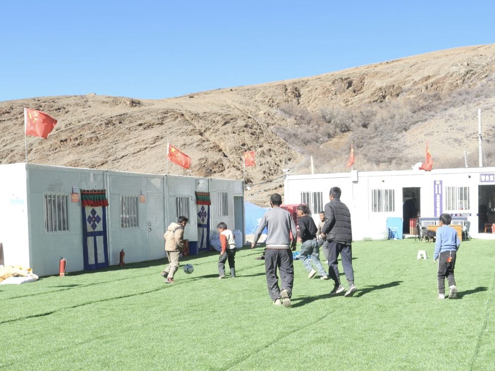1月27日,在定日縣長所鄉(xiāng)古榮村板房安置點,孩子們正在踢足球。(受訪者供圖)