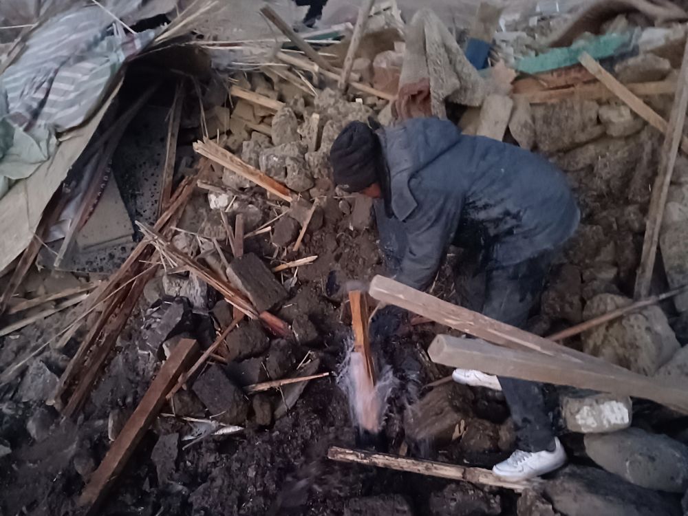 1月22日,在定日縣長所鄉(xiāng)古榮村,旦增正在修爆掉的水管。(受訪者供圖)