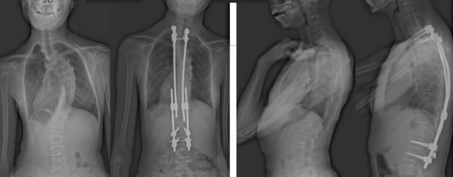白瑪今年10歲,正在讀小學(xué)。媽媽發(fā)現(xiàn),白瑪經(jīng)常歪著肩膀,在反復(fù)提醒“站直了,別歪著”后,情況也沒有改善。近半年來,白瑪?shù)挠覀?cè)肩胛骨逐漸向后凸出。到醫(yī)院檢查后發(fā)現(xiàn),白瑪?shù)男刈荡嬖诿黠@的側(cè)凸畸形,是早發(fā)型特發(fā)性脊柱側(cè)凸。由于側(cè)凸較為嚴(yán)重,已經(jīng)失去了支具治療的機(jī)會。小白瑪才10歲,隨著身體的不斷成長,她的脊柱會越來越彎,肩膀會越來傾斜。這不僅影響體態(tài)和外觀,也可能限制心、肺等內(nèi)臟器官的發(fā)育,導(dǎo)致心肺功能下降、肢體活動不便,出現(xiàn)癱瘓,甚至死亡。對于白瑪這種情況,只能利用手術(shù)治療來矯正脊柱、阻止骨骼畸形進(jìn)展。