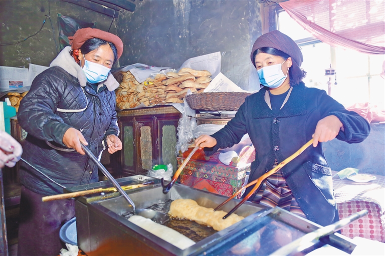 旦索朗一家,在每年藏歷新年前夕,都會(huì)開(kāi)啟一年中最為繁忙的時(shí)光——經(jīng)營(yíng)“卡賽”生意。旦索朗回憶往昔,感慨萬(wàn)千:“小時(shí)候過(guò)年,炸‘卡賽’是家家戶(hù)戶(hù)的頭等大事,整個(gè)村子都彌漫著誘人的香氣,那是新年專(zhuān)屬的味道。如今,時(shí)代在變遷,人們的生活方式也發(fā)生了改變,越來(lái)越多的人選擇購(gòu)買(mǎi)成品‘卡賽’,這既契合了快節(jié)奏的現(xiàn)代生活,也為我們提供了發(fā)展的機(jī)遇。我們經(jīng)營(yíng)‘卡賽’生意已有6年,這期間,靠著誠(chéng)信經(jīng)營(yíng)和對(duì)高品質(zhì)的堅(jiān)守,生意蒸蒸日上,還帶動(dòng)了6名村民共同增收,大家一起用雙手創(chuàng)造美好生活?!?/p>