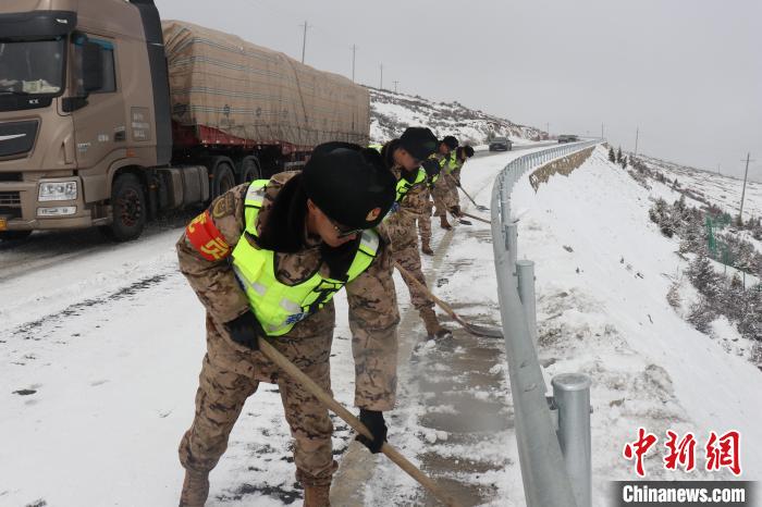 在嚴寒天氣里,武警官兵克服高寒缺氧的惡劣環(huán)境,累計清雪5500余立方米,解救滯留車輛200余輛,恢復道路暢通。