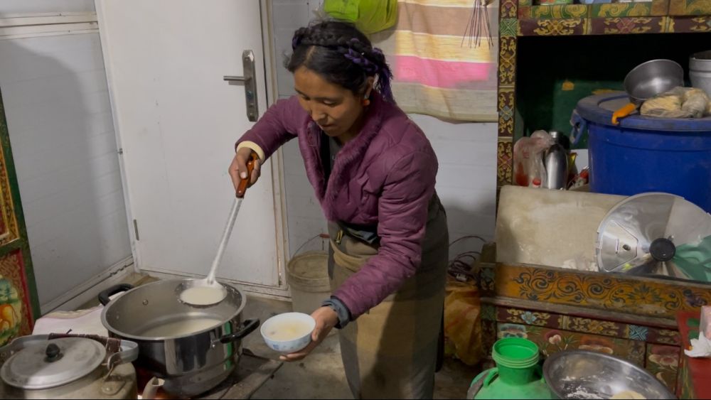 2月27日,阿旺次仁的妻子拉巴普尺正在盛“古突”。新華社記者 蔣夢(mèng)辰 攝