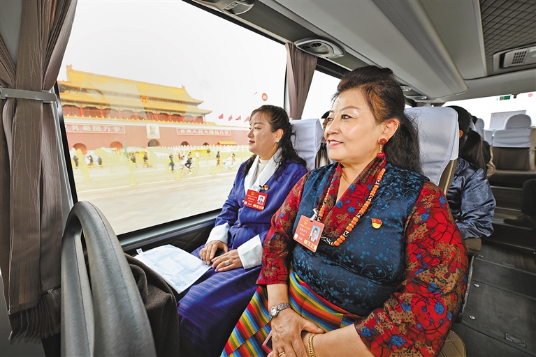 圖為人大代表們乘車前往駐地的途中經(jīng)過天安門廣場。 記者 旦增西旦 攝