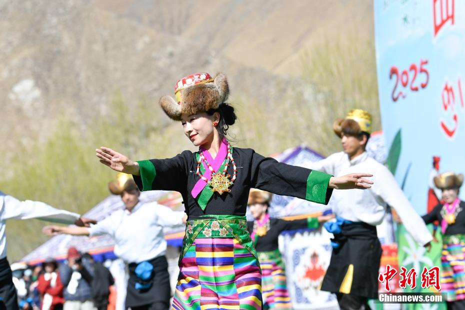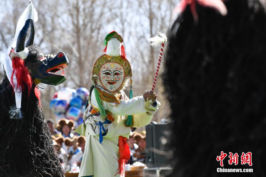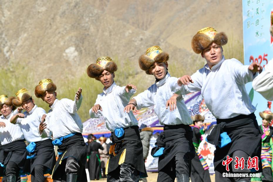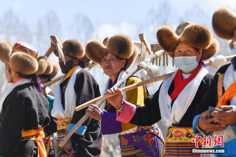 3月16日,西藏拉薩迎來一年一度的傳統(tǒng)春耕儀式。當(dāng)日,拉薩市曲水縣色達(dá)村村民身著節(jié)日盛裝,相聚在田間,載歌載舞,共同迎接春耕第一犁。家家戶戶端著自家的“切瑪”(象征五谷豐登)帶著青稞酒、酥油茶等物品聚在田間,互敬青稞酒,開始撒種,祈求全年風(fēng)調(diào)雨順、五谷豐登。圖為曲水縣色達(dá)村春耕儀式現(xiàn)場(chǎng),當(dāng)?shù)孛癖姳硌輫壹?jí)非物質(zhì)文化遺產(chǎn)《吉祥仲孜》。中新社記者 貢嘎來松 攝