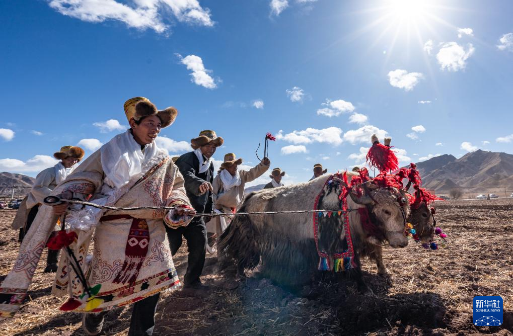 3月16日,在拉薩市林周縣春堆鄉(xiāng)春耕典禮上,農(nóng)民沿襲傳統(tǒng),使用“二牛抬杠”的方式翻土犁地。新華社記者 丁增尼達(dá) 攝