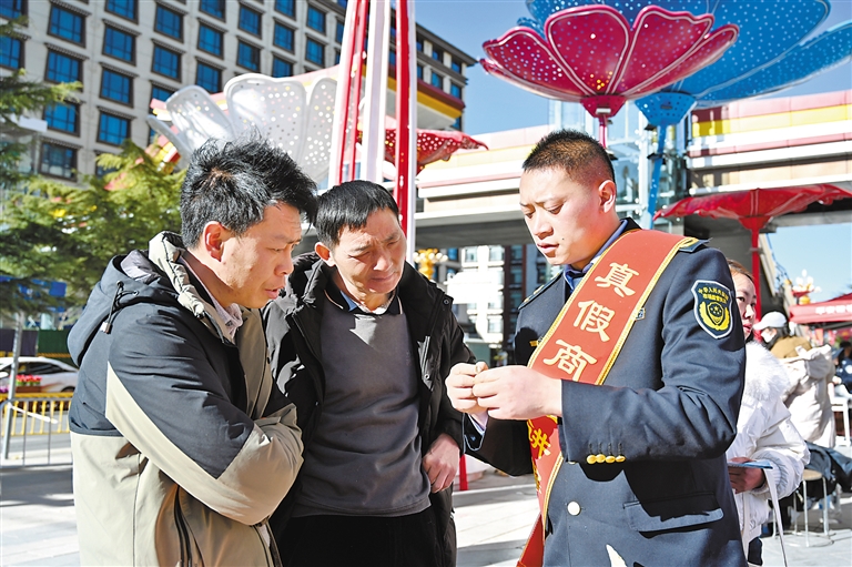 圖為桑珠孜區(qū)市場監(jiān)管局投訴舉報中心負責(zé)人李良友(右)向市民講解商品真假辨別方法。 記者 扎西頓珠 攝