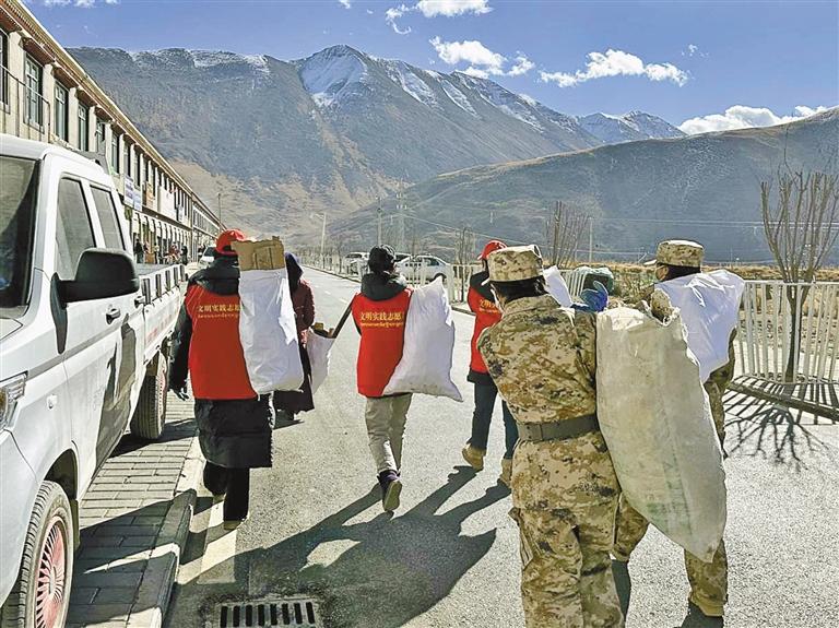 圖為唐古鄉(xiāng)黨委組織各村清理國(guó)道沿線垃圾。圖/文 記者 拉巴桑姆