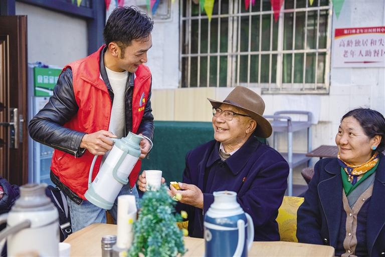 “波啦,您來啦,快坐下來喝點(diǎn)熱茶?!薄澳?,待會午飯?jiān)谶@邊吃嗎?”近日,記者來到拉薩市城關(guān)區(qū)蕃陽社會工作者和志愿者服務(wù)協(xié)會下的策門林老年日間照料中心,剛進(jìn)大門就被一群正在鍛煉身體的老人所吸引。他們跟著老師抬手、踢腿、扭腰,動作整齊劃一,臉上洋溢著幸福的笑容。鍛煉結(jié)束后,赤來回到助餐區(qū),邊喝甜茶邊吃“卡賽”,和老人們分享趣聞,拉著家常,現(xiàn)場傳來一陣陣歡聲笑語。