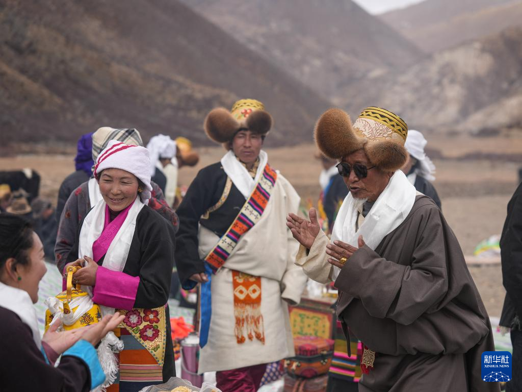 旺慶老人(右)在春耕大典上為客人敬酒獻(xiàn)唱(3月16日攝)。新華社記者 晉美多吉 攝