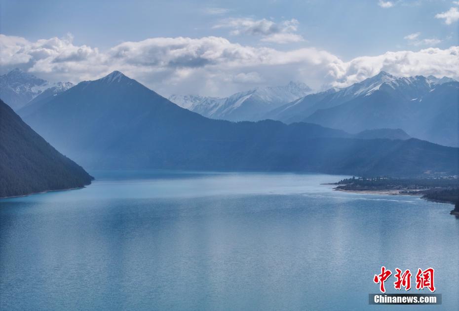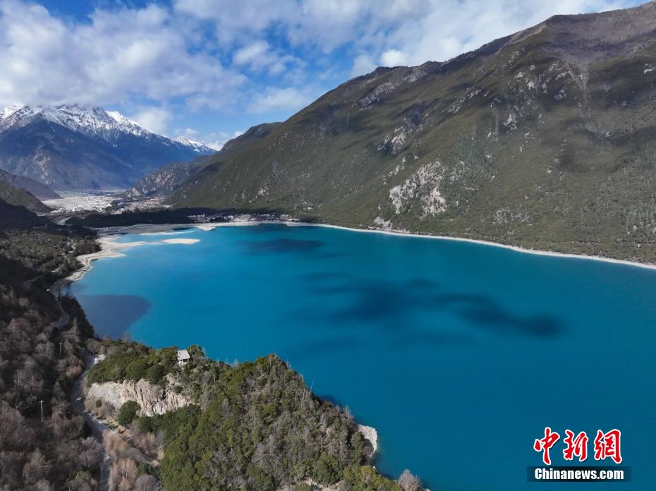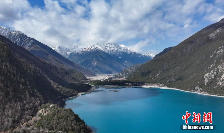 3月30日,航拍巴松措春日風(fēng)景。巴松措又名錯高湖,位于西藏自治區(qū)林芝市工布江達縣,是西藏首個自然風(fēng)景類國家5A級旅游風(fēng)景區(qū)。從空中俯瞰巴松措,碧藍的湖水被雪山、森林環(huán)繞,宛如鑲嵌在群山間的“藍寶石”。(無人機照片)中新社記者 馬銘言 攝