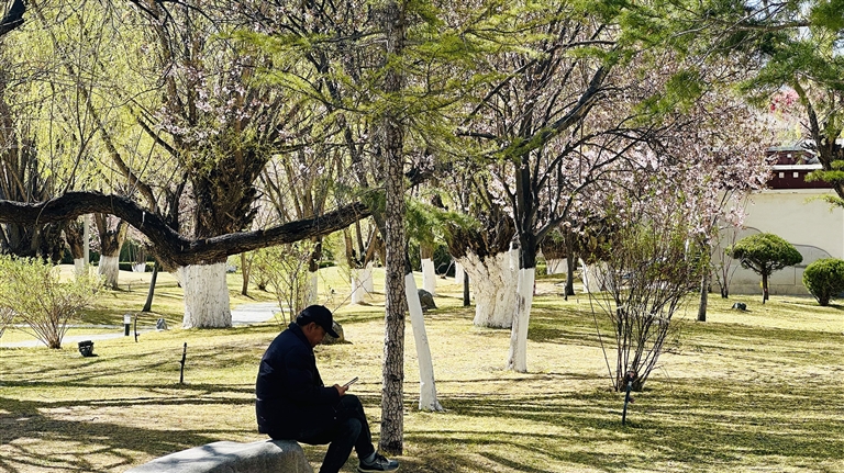 這幾條路相連接,一路都是榆葉梅、紫葉李、桃樹等,成團(tuán)成簇的花朵裝點(diǎn)著街道,綠化帶里的蒲公英也冒出頭來,小黃花零星綻放。一路走來,有看不完的花,賞不完的景。你只需放慢腳步,便能在最常走的路上,邂逅拉薩明媚的春光。