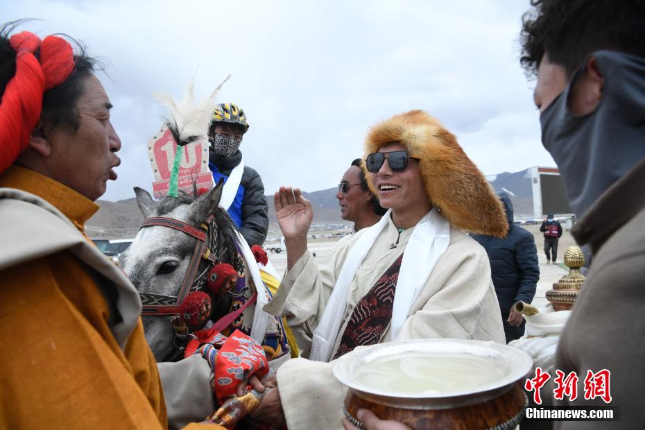 圖為頒獎儀式上馬主喝青稞酒慶祝。中新社記者 貢嘎來松 攝