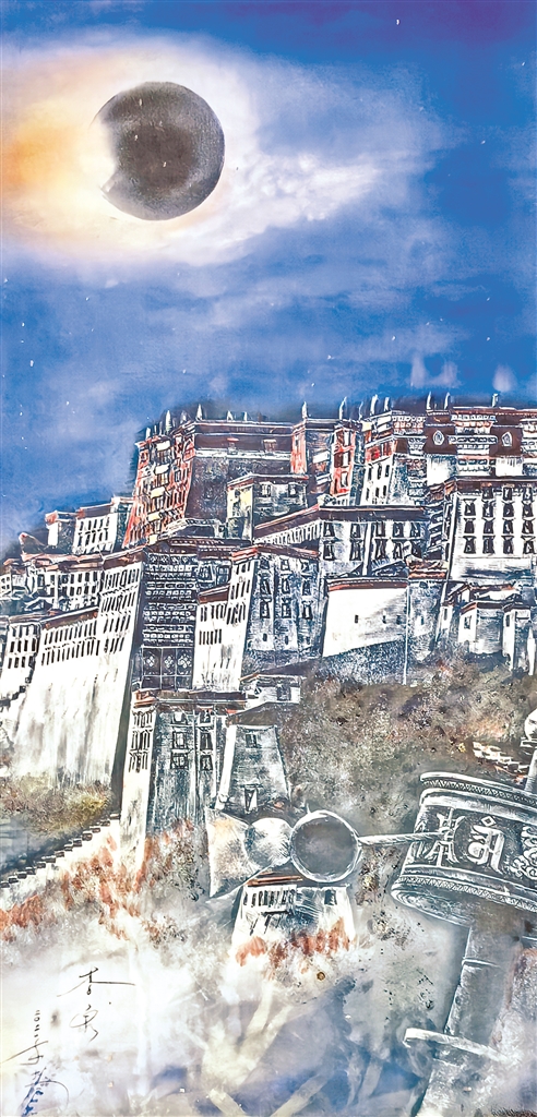圖為瓷板畫作品《朝霞中的布達拉宮》(局部)。